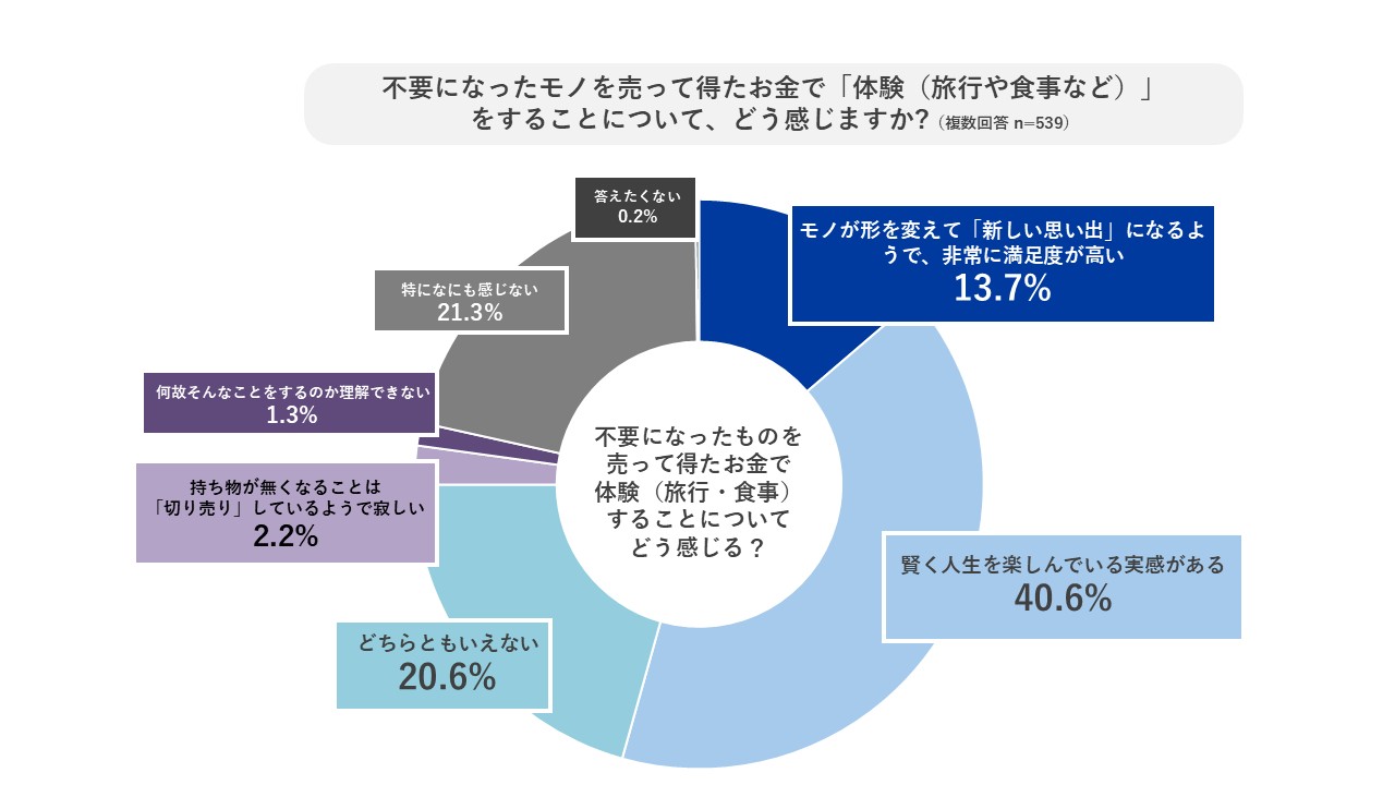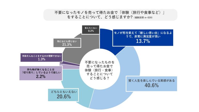 こうした、不要なモノを売って体験に変えるライフスタイルについて、13.7%が「モノが形を変えて『新しい思い出』になるようで非常に満足度が高い」、40.6%が「賢く人生を楽しんでいる実感がある」と計54.3%のアクティブシニアが肯定的に評価しており、モノからコトへの循環消費に意欲的であることがわかった。