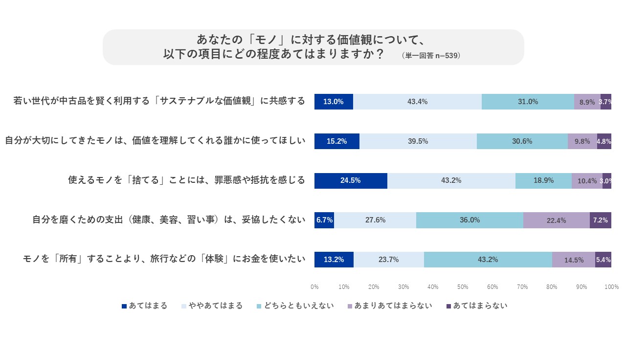 例えば、「使えるモノを『捨てる』ことには、罪悪感や抵抗を感じる」と回答した人は67.7%、また、「自分が大切にしてきたモノは、価値を理解してくれる誰かに使ってほしい」と考える人も54.7%と半数を超えている。