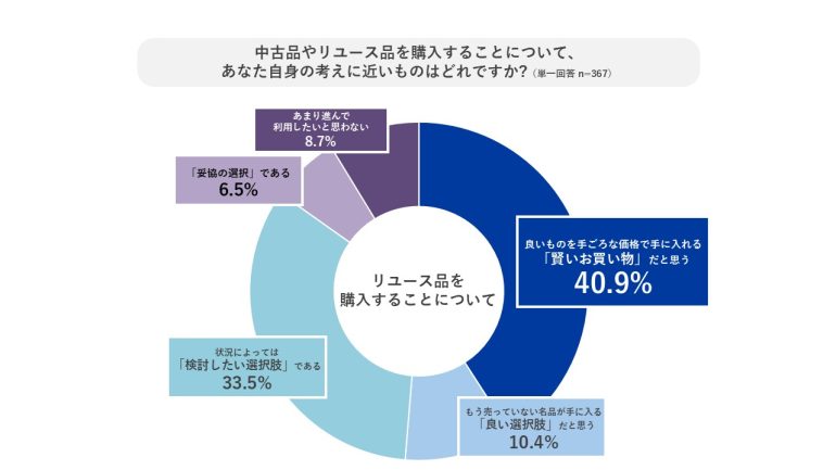 リユース品を購入することについては、「良いものを手ごろな価格で手にいれる『賢い買い物』だと思う(40.9%)」、「もう売っていない名品が手に入る『良い選択肢』だと思う(10.4%)」、「品物やジャンルにもよるが、状況によっては『検討したい選択肢』である(33.5%)」を合わせ、84.8%が肯定的に捉えていた。リユースの活用についてもポジティブな回答が多い結果に。