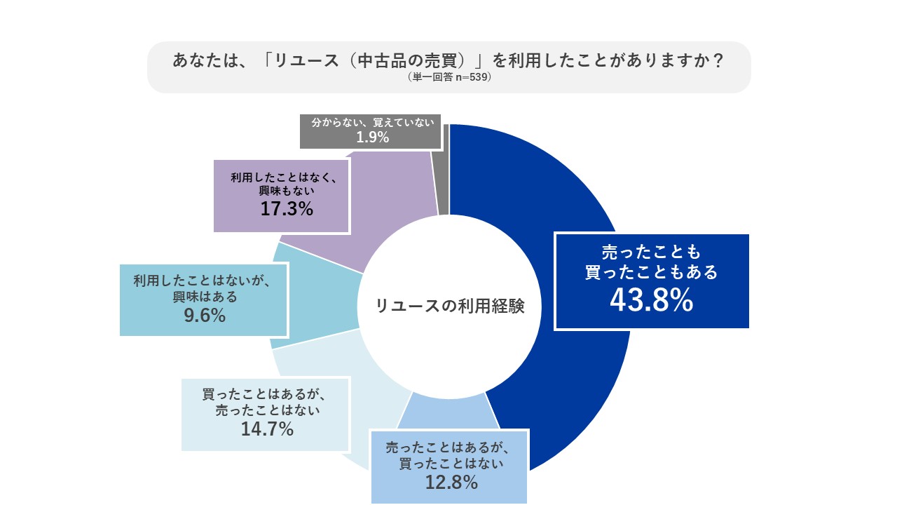 リユース(中古品の売買)の利用経験については、71.3%が「ある」と回答した。内訳は「売ったことも買ったこともある」が43.8%と最も多く、売買の双方向で活用が進んでいる実態が明らかに。
