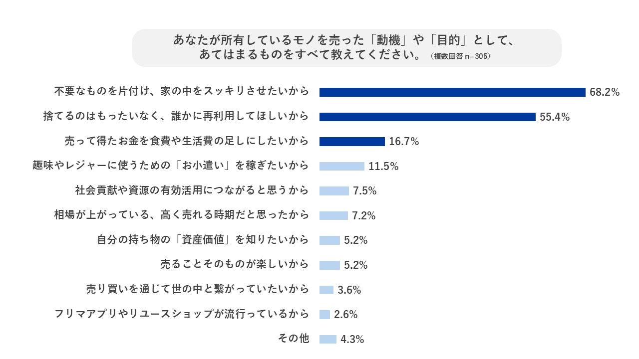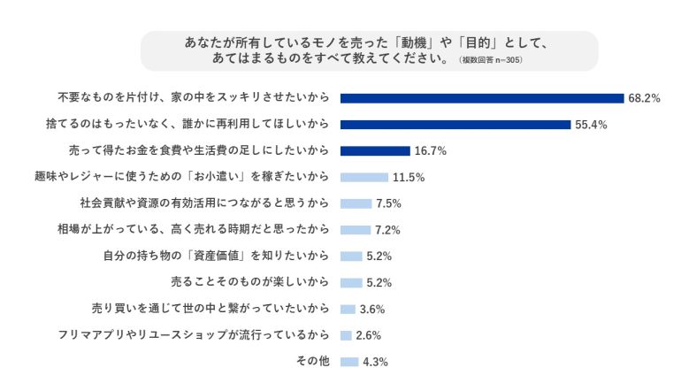 売却の動機としては「不要なものを片付け、家の中をスッキリさせたいから(68.2%)」が最多で、次に「捨てるのはもったいなく、誰かに再利用してほしいから(55.4%)」となった。