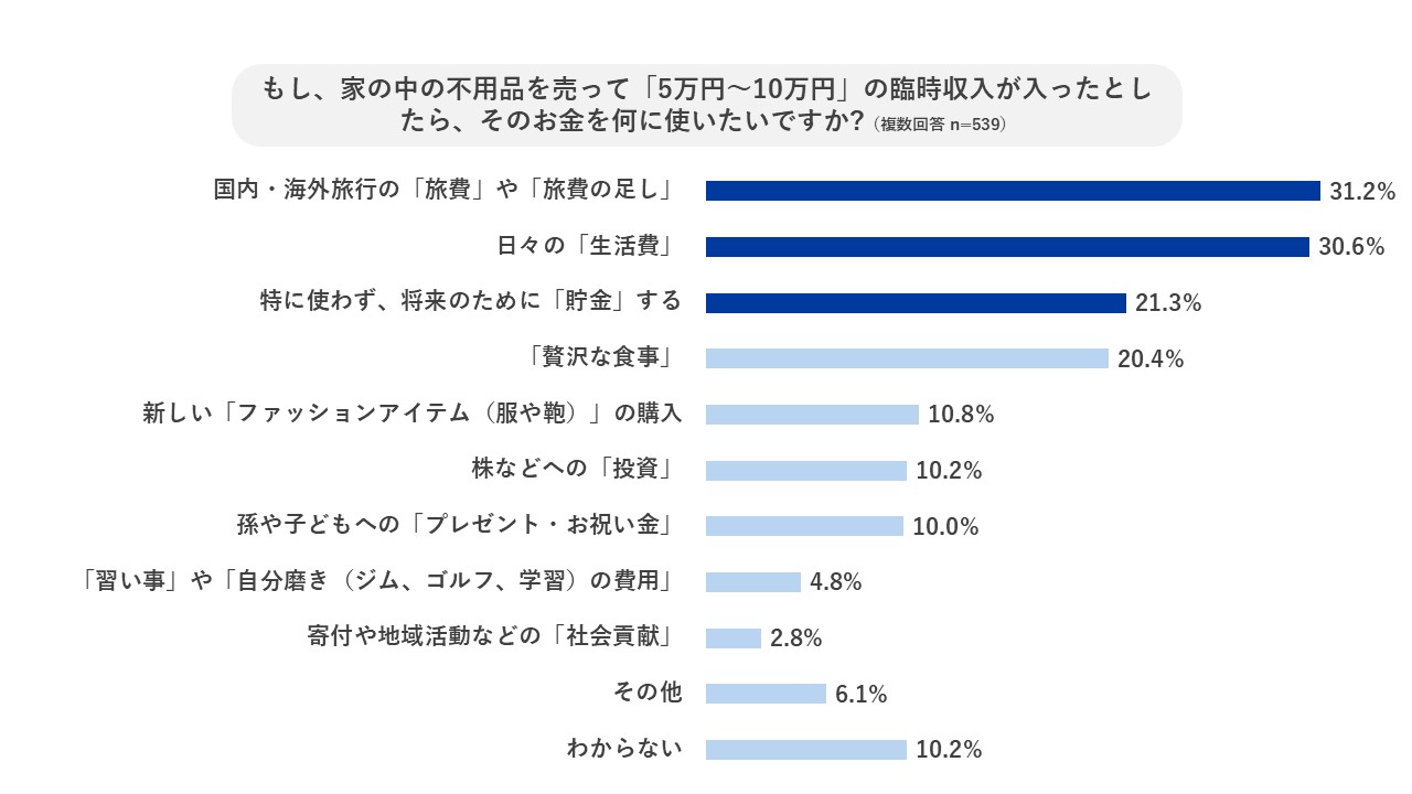 「もし、家の中の不用品を売って「5万円~10万円」の臨時収入が入ったとしたら、そのお金を何に使いたいですか」と聞いたところ、1位は「国内・海外旅行の『旅費』や『旅費の足し』(31.2%)」となり、「日々の『生活費』(30.6%)」を上回った。