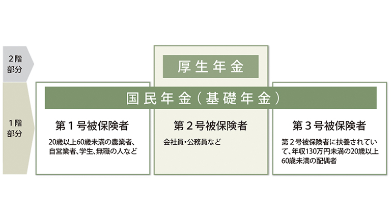 日本では20歳以上60歳未満の人すべてが加入する国民年金(基礎年金ともいいます)と、会社員・公務員が加入する厚生年金の、2階建て構造になっています。