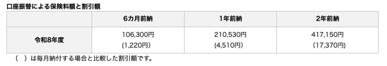 6か月前納、1年前納、2年前納があり、口座振替の場合、6か月前納では1220円、1年前納では4510円が割引されます。中でも2年前納は令和8年度と令和9年度の保険料をまとめて納付することで、1万7370円割引されます。