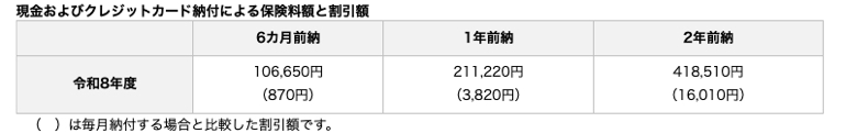 例:2年前納(現金・クレジットカードなどの割引額1万6010円)を1%還元されるクレジットカードで支払った場合、割引とポイントを合わせて実質2万195円分がお得になる計算です。