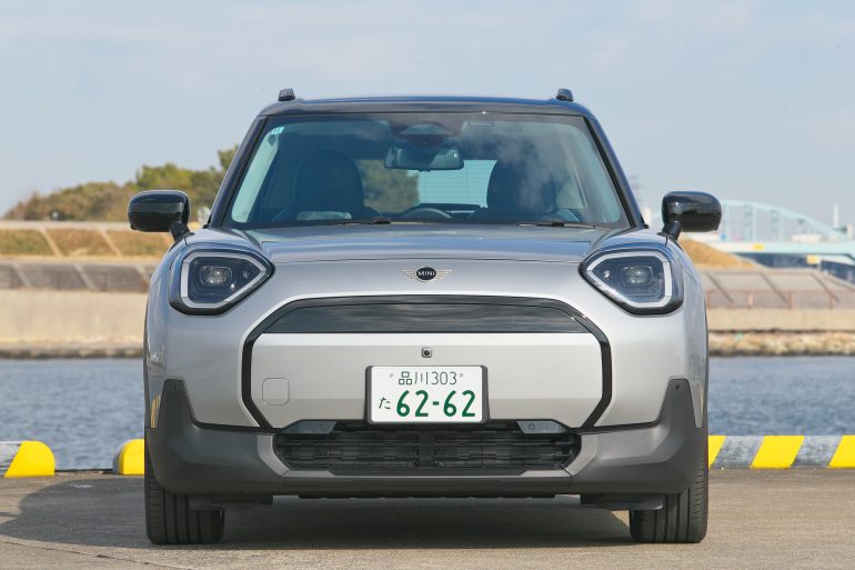「エースマン」はEV専用に設定されたモデルで、ボディーサイズは全長4080mm、全幅1755mm、全高1515mm、ホイールベース2605mmで、3ドア、5ドア「ミニクーパー」や「カントリーマン」とも異なるサイズのボディだ。フロントフェイスは「カントリーマン」と共通するデザインを採用しているが、サイズが違う。「カントリーマン」のほうがひと回り以上大きい。