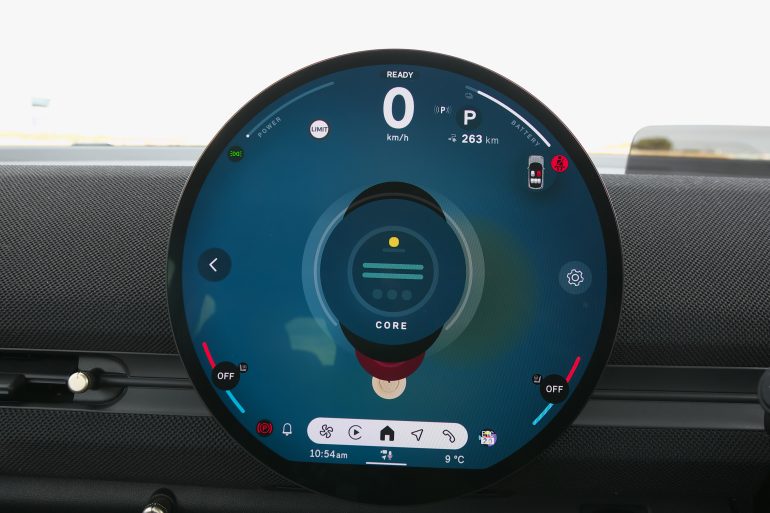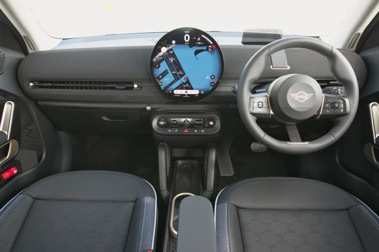 内装も基本的には「ミニ クーパー」と同じ仕様だ。大きな丸型の有機ELセンターディスプレイは、ダッシュボードの中央に置かれている。直径240mmの高品質ガラスが用いられ、高感度なタッチ機能も備えている。操作項目はメーターパネルとしての機能はもちろん、AD機能付きのナビシステム、メディア、電話、エアコン、各種設定などがこの円型ディスプレイでできる。さらに円型ディスプレイは8パターンの光のグラフィックを投影させることができる。