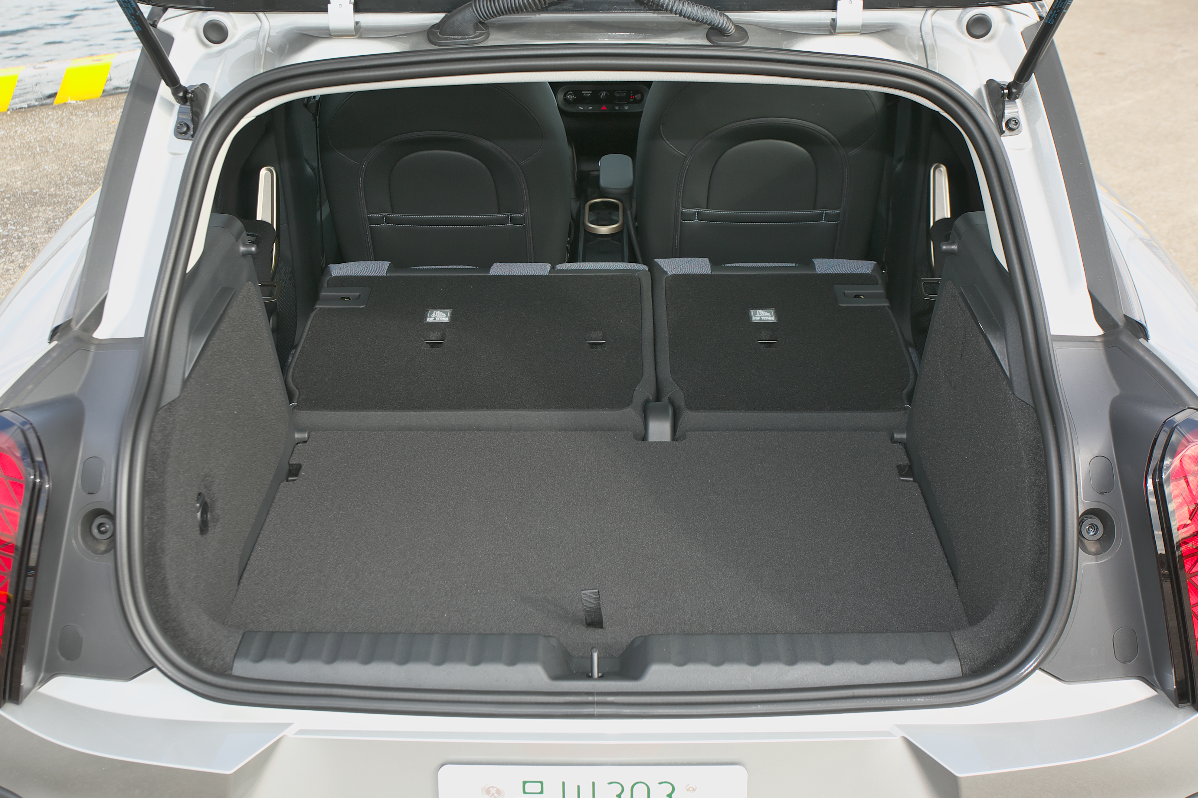 このように、エンジンMINIとEV MINIの良い部分を取り入れてクルマづくりが行われている。居住空間もリアシートはやや低めの着座で、頭上のスペースを確保。足元は中央のトンネルが大きく張り出しているので、着座は左右1名ずつ。左右1人掛けが快適定員だ。車体後方の荷室スペースも床板の下にはサブトランクスペースが設けられており、この空間に充電ケーブルを収納することができた。