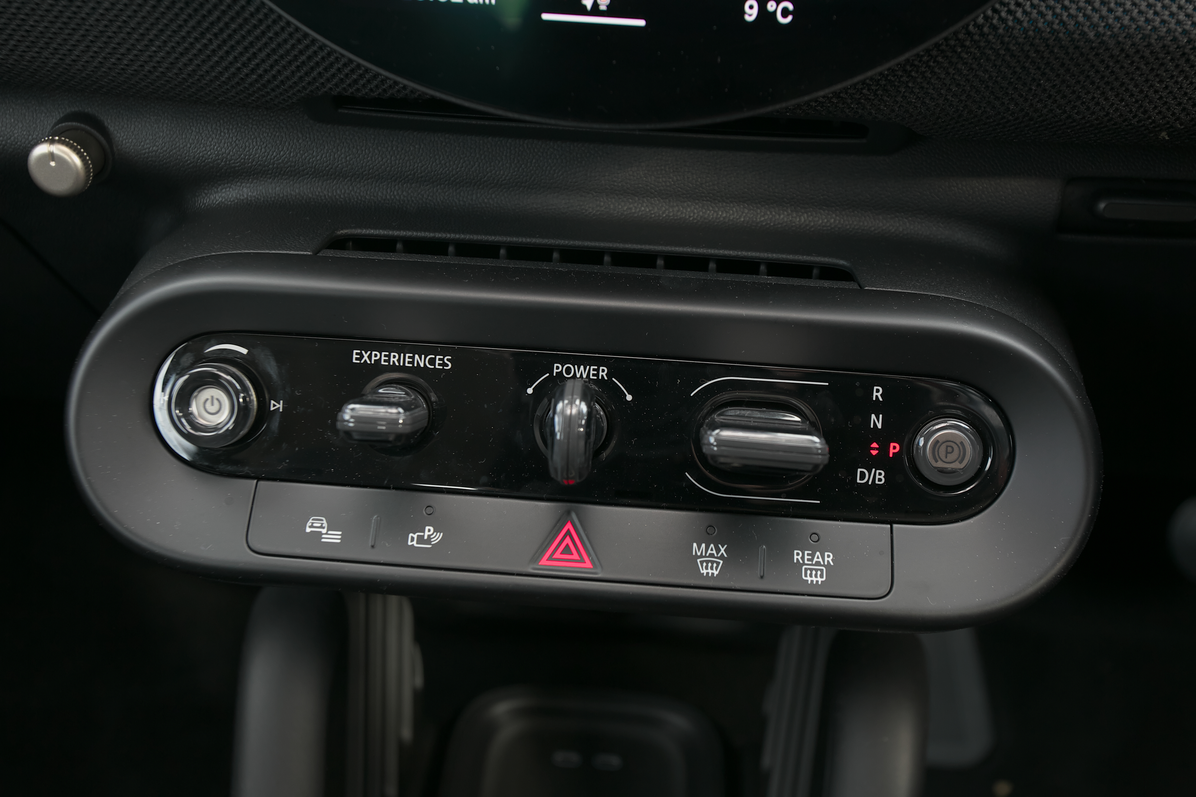 内装も基本的には「ミニ クーパー」と同じ仕様だ。大きな丸型の有機ELセンターディスプレイは、ダッシュボードの中央に置かれている。直径240mmの高品質ガラスが用いられ、高感度なタッチ機能も備えている。操作項目はメーターパネルとしての機能はもちろん、AD機能付きのナビシステム、メディア、電話、エアコン、各種設定などがこの円型ディスプレイでできる。さらに円型ディスプレイは8パターンの光のグラフィックを投影させることができる。