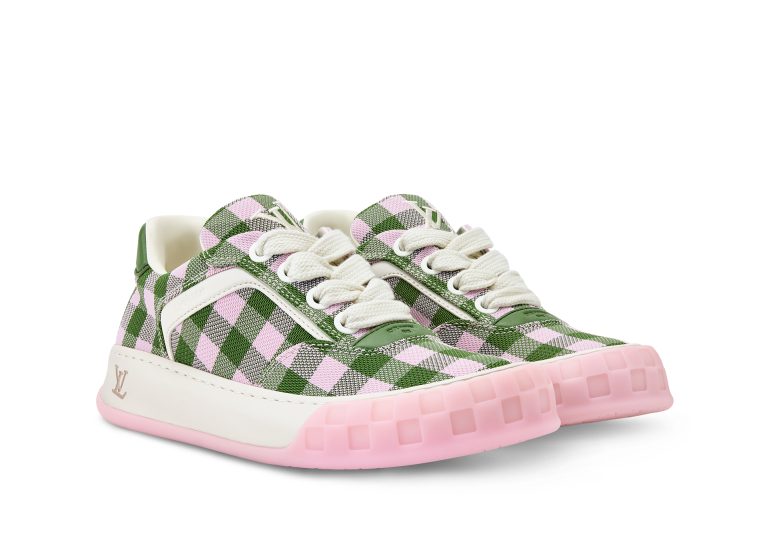 今シーズンのキーモチーフである、カラフルなギンガムをプリントしたミックス素材で仕上げた「LV ティルテッド スニーカー」。