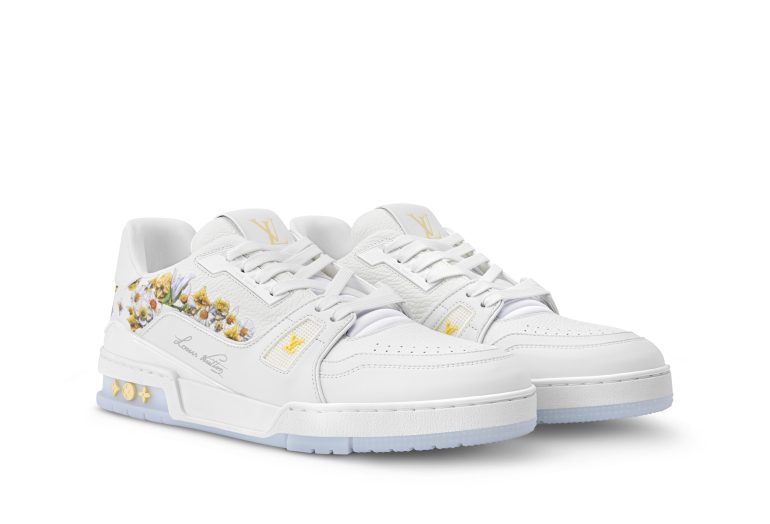 2026春コレクションならではのフローラル·モチーフが刺繍であしらわれた、しなやかなグレインレザーの「LV トレイナー スニーカー」。