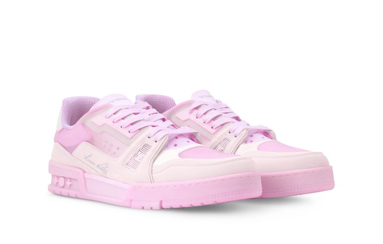 バスケットボールから着想を得たこのモデルのアウトソールには、3つのモノグラム·フラワーが新鮮なパステルカラーで彩られ、上品な印象を演出する。サイドには手書き風の「Louis Vuitton」シグネチャーの刺繍をプラス。