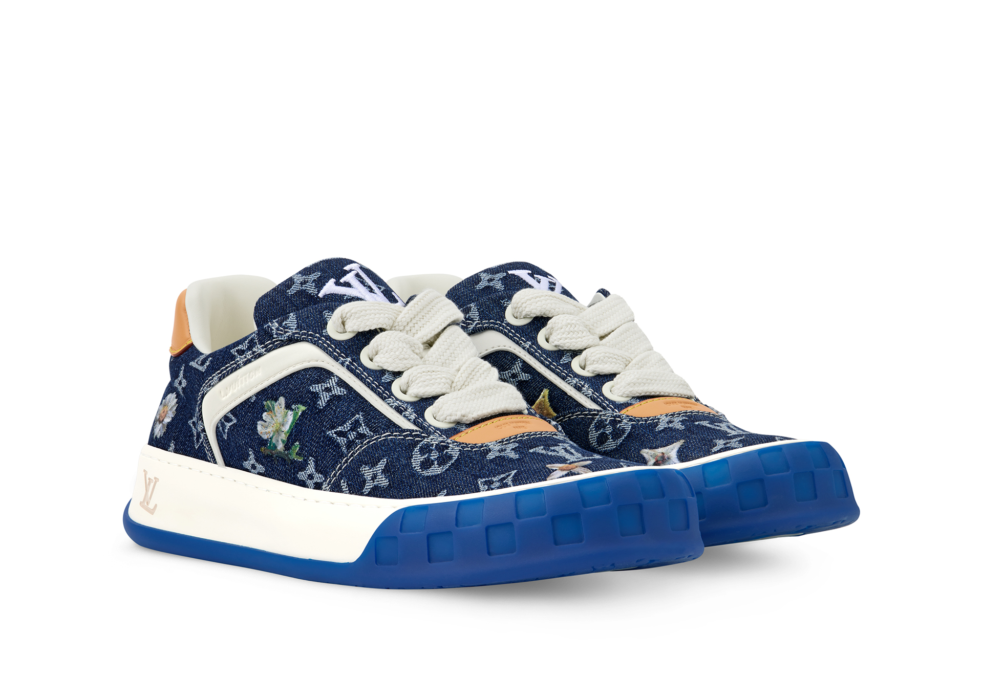 フラワー·モチーフの刺繍で彩られたモノグラム·デニムの「LV ティルテッド スニーカー」。スケートボードシューズから着想を得たこのモデルには、その名の通りやや傾斜したLV イニシャル シグネチャーがあしらわれ、スケートボードの動きを想起させる。