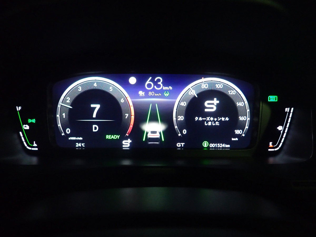 「プレリュード」のトランスミッションは2基のモーターを組み込んだCVTだから、無段で変速していく。モーターと接続されている相乗効果もあって、きわめてスムーズに変速していく。しかし、それでは面白くないと不満を抱く人のために、この「S+Shift」が開発されたのだろう。8段の変速が行われたかのようにエンジン回転数をコントロールし、従来タイプのMTの変速機の段があるかのようなダイレクトな駆動レスポンスと変速感を演出している。