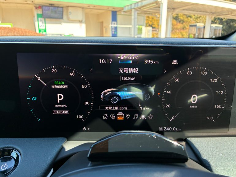 一方で、回生ブレーキのオートモードの効きは乗り始めから明確に感じられた。前車との車間距離をクルマがつねに監視していて、それに応じて回生ブレーキが無段階に強められていく。逆も作用する。この機能をオンオフするのもハンドル左上のマークを押すたびに変わっていく。マーク自体が青く点灯し、メーターパネル内にも表示が現れる。この操作も簡単で、使いやすい。日産では「インテリジェントディスタンスコントロール」と称しているが、他メーカーのものと機能もほぼ変わらない。