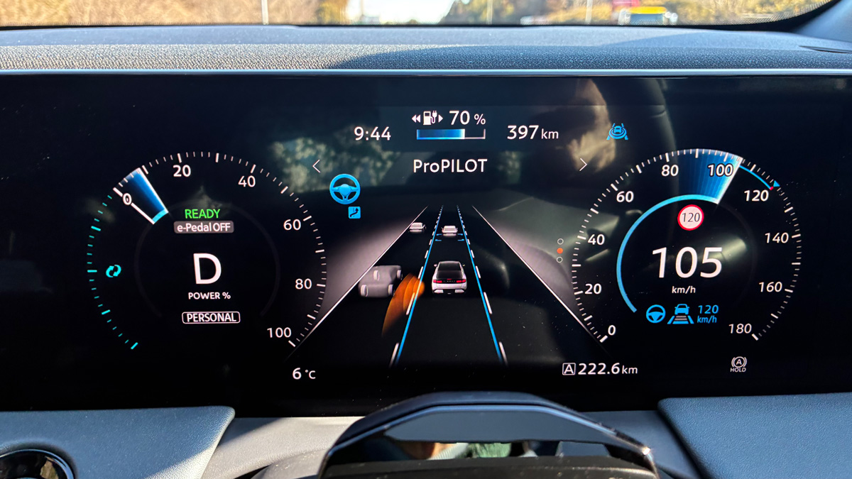 条件が整うと、メーターパネル上の運転支援機能の作動表示がグリーンからブルーに変わって、より高度な「Pro PILOT 2.0」が作動中であることを示すようになる。2.0では、120km/hまで、前車に追従し、レーンキープを保ちながらドライバーはハンドルから両手を離すことができる。今回の試乗コースでは、実際に意識して確かめられた距離が10数kmと短かったので効能を実感できなかったが、これが50km、100kmと長くなるに従ってドライバーの眼と脳と右足の負担が減ることを実感できるだろう。