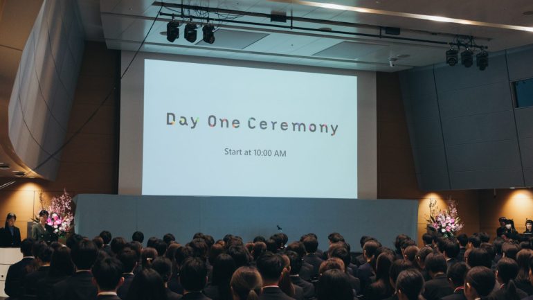 「Day One Ceremony 2026」で緊張する新入社員を前に登壇した松本社長は「何を隠そう私も本日社長に就きました。勝手ながら皆さんを精神的同期と捉えていますので、これからも末長くよろしくお願いいたします。たまには同期会に誘ってください」と切り出し、会場は大きな笑いに包まれた。