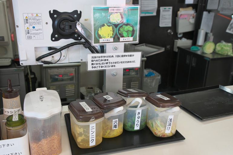 また使われているタレは、甘さとスパイシーさのバランスが良く、ほのかに感じる酸味がコウネや野菜の甘さを引き立ててくれる。生姜焼きもメニューにあるが、使っているタレは変えているというこだわりがある。配膳台には、浅漬け、きゅうり、たくわんなどお漬物バーが設置されている。なお浅漬けは手作りのため、1日に提供する量が限られているのでなくなり次第終了となるのは覚えておきたい。