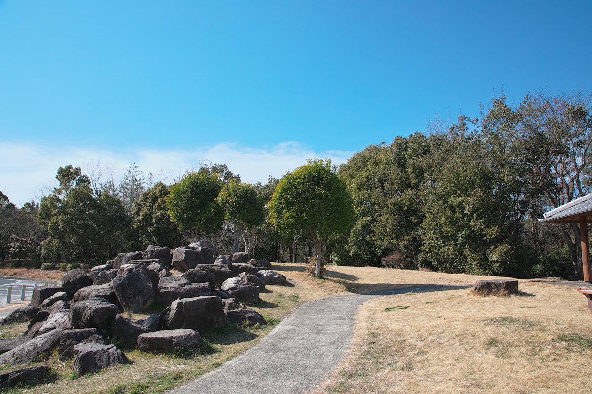 広島県三原市にある山陽自動車道八幡PA上りは、大型64台、小型32台というコンパクトな施設だ。純和風の建物の横には広場が広がっており、リードを付けたペットの散歩なども行える。また、広場に使用されている石は自然石を有効活用している。