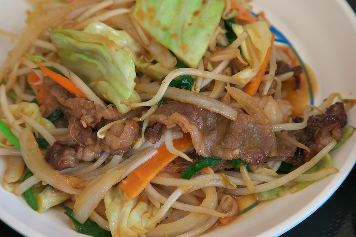 このコウネにキャベツ、もやし、にんじん、ニラ、玉ねぎといった約200gの野菜を炒めたボリューム満点のおかずだ。コウネは濃厚な味わいが特徴で、噛めば噛むほど旨みが溢れてくる。野菜の炒め時間は抜群で、どの野菜もシャキシャキ感が残りコウネとのコントラストが絶妙でご飯が進む。