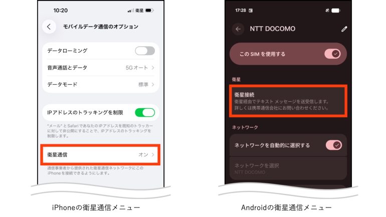 最新のソフトウェアにアップデート後、設定画面から「衛星通信」がONになっていることを確認。