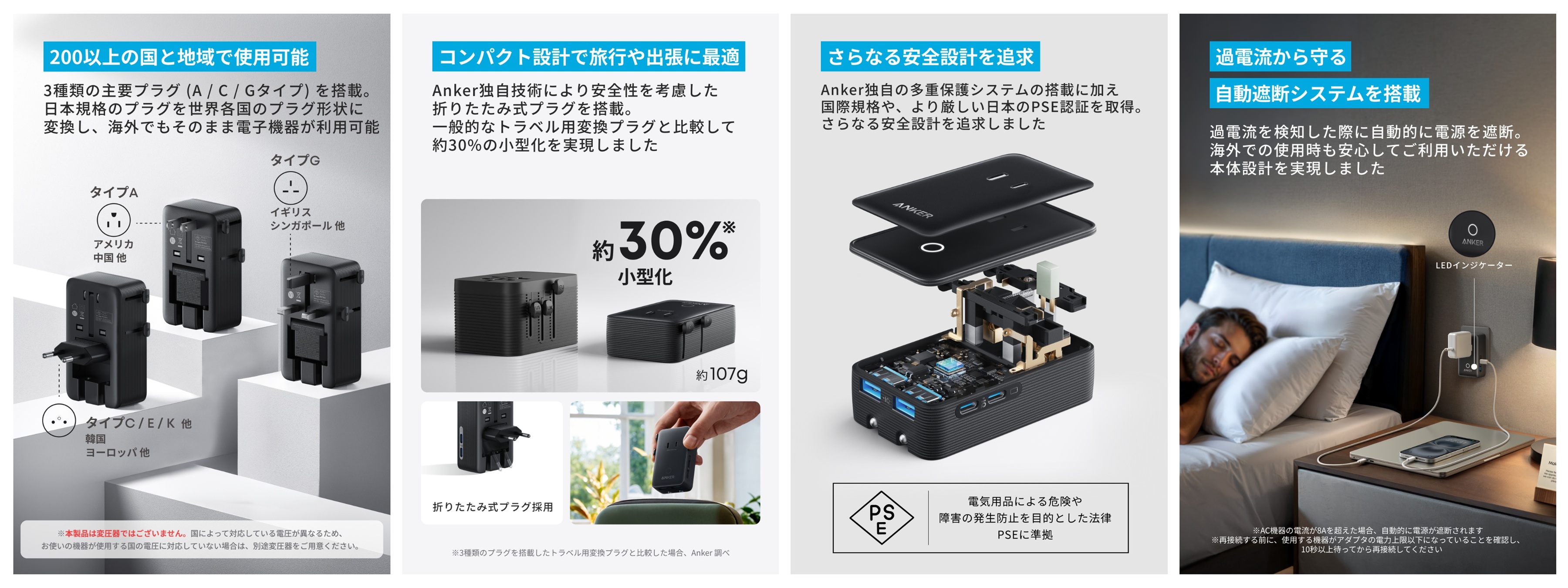 さらに、過電流を検知すると自動的に電源を遮断する自動電源制御システムの搭載やPSE認証の取得に加え、国際規格に準拠した感電防止設計の2ピン構造を採用しているため、海外への旅行や出張時も安全に使用できる。