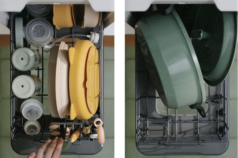 「LISSOME J1」は、幅28cmの世界最薄級スリムボディに噴射力100,000Paの業界最強級洗浄力を備え、さらにはAI自動最適化洗浄機能も搭載した食洗機。同社従来品よりも幅を約50%もカットしたにも関わらず、最大22点の食器が一度に片付く大容量を実現。庫内の奥行きが約28.7cmと余裕があるため、9号の土鍋(4人分、直径27cm)も洗浄可能だ。