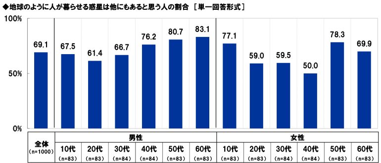 地球のように人が暮らせる惑星は他にもあると思うか聞いたところ、あると思う人の割合は69.1%となった。男女・世代別にみると、男性では20代以降で年代が上がるにつれてあると思う人の割合が上昇する傾向がみられた。