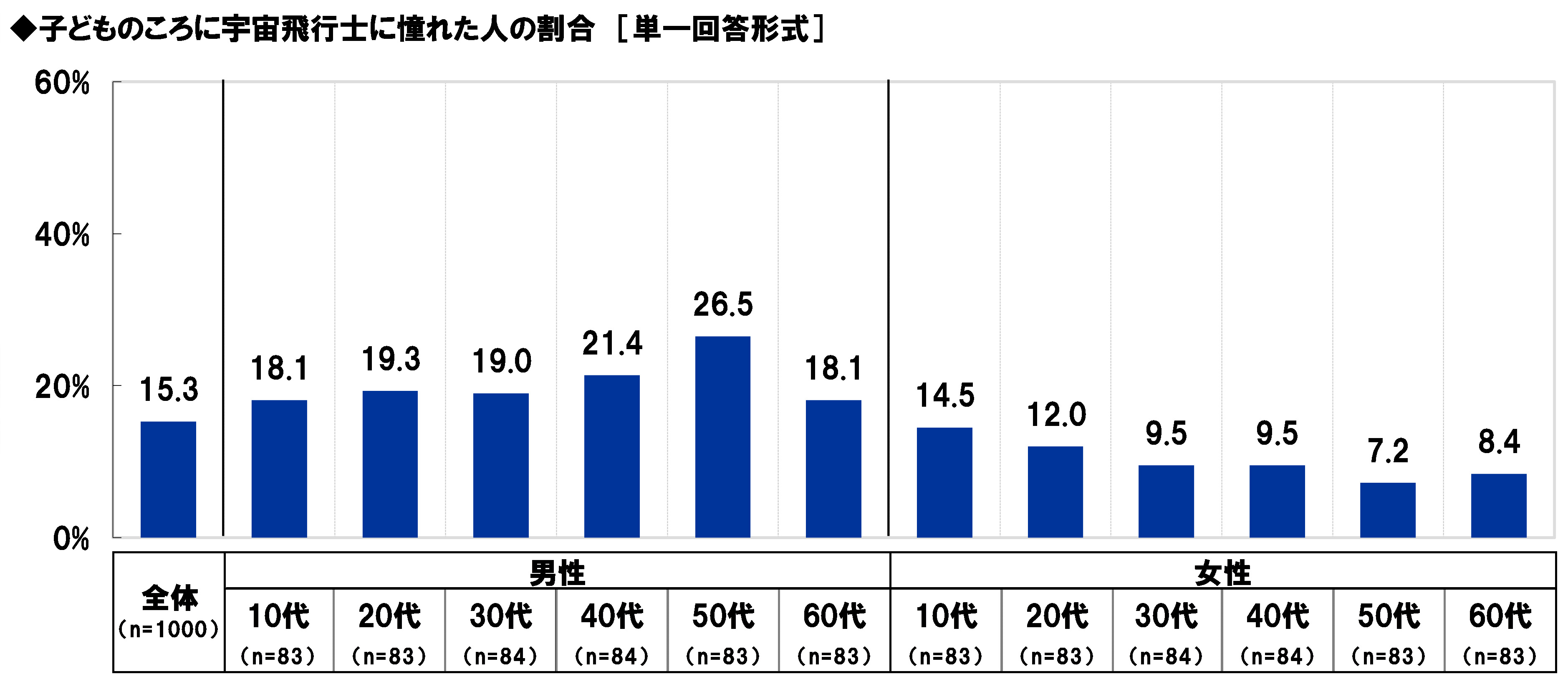 宇宙への憧れ 「子どものころに宇宙飛行士に憧れた」15%、50代男性では27%