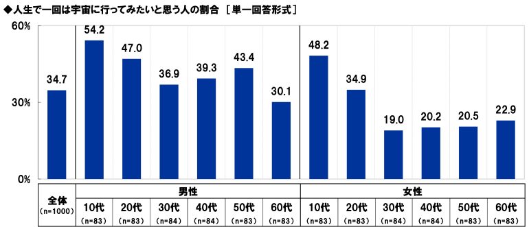 人生で一回は宇宙に行ってみたいと思うか聞いたところ、行ってみたいと思う人の割合は34.7%となった。男女・世代別にみると、行ってみたいと思う人の割合は、10代男性(54.2%)が最も高く、半数を超えた。また、次いで高くなったのは10代女性(48.2%)となった。
