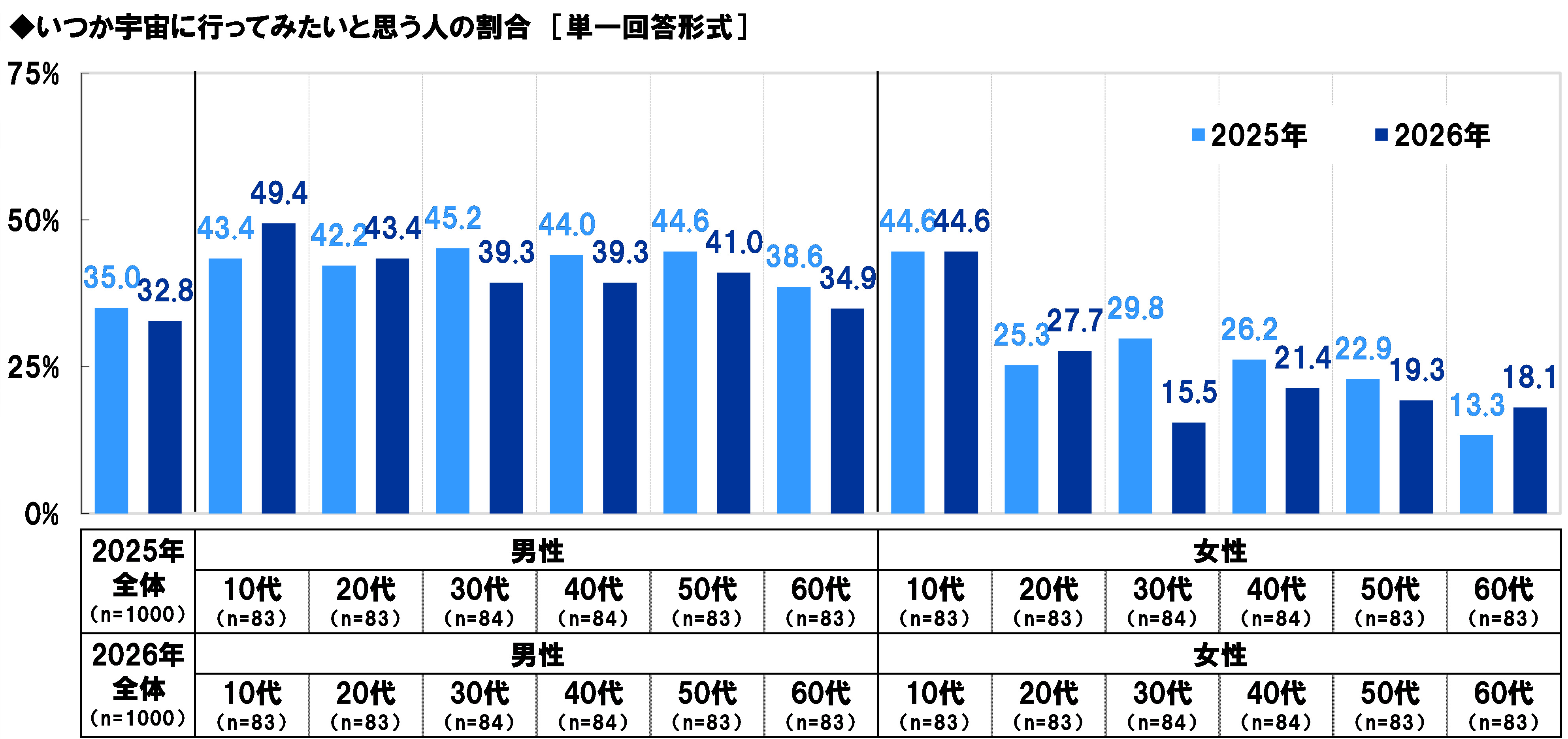 前回の調査結果と比較すると、行ってみたいと思う人の割合は、10代男性(2025年43.4%→2026年49.4%)では昨年から6.0ポイント上昇した。一方、30代女性(2025年29.8%→2026年15.5%)では昨年から14.3ポイント下降する結果となった。