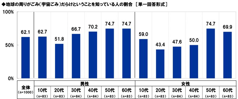 全回答者(1,000名)に、地球の周りがごみ(宇宙ごみ)だらけということを知っているか聞いたところ、知っている人の割合は62.1%と、過半数となった。