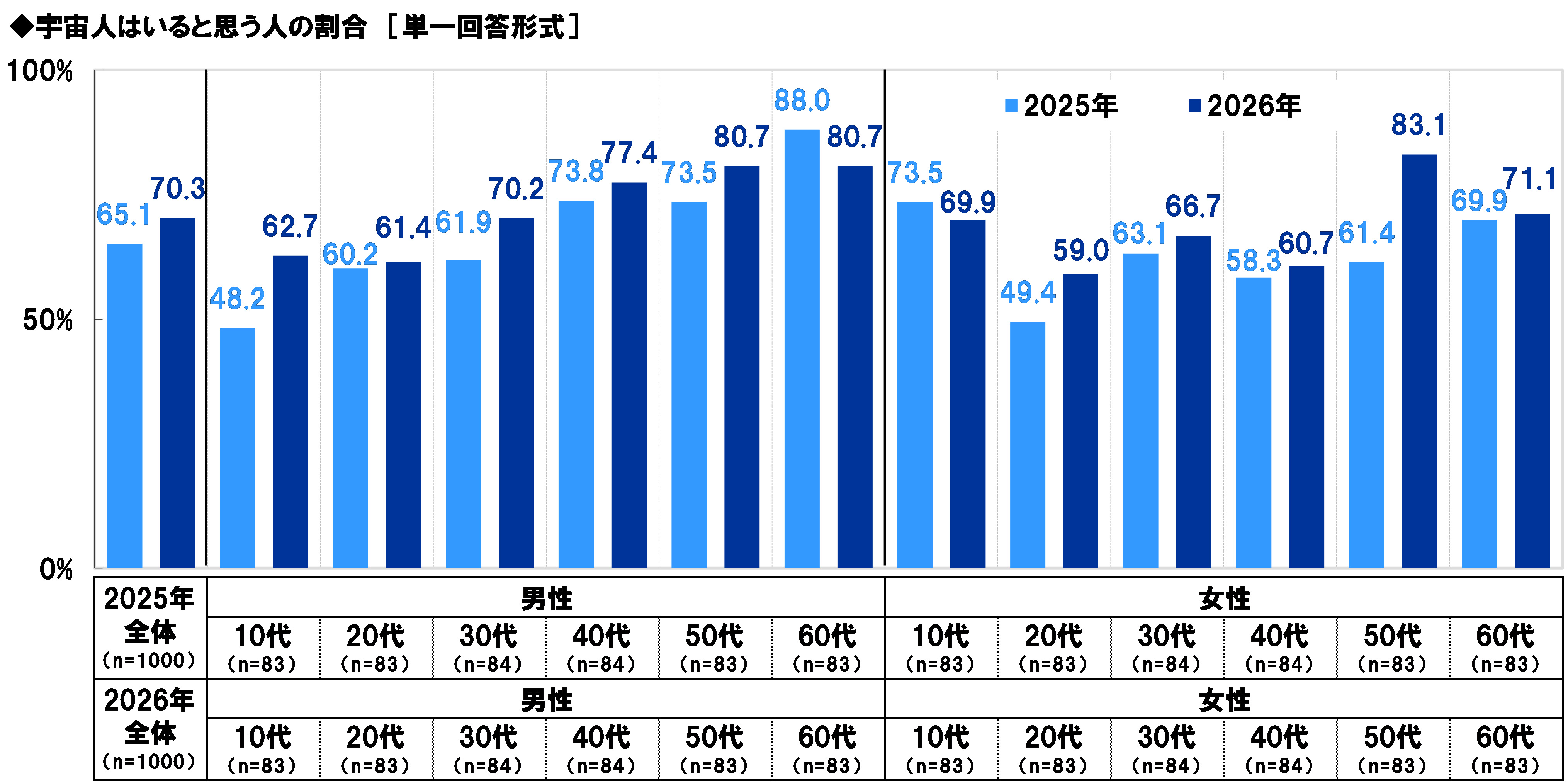 宇宙人はいると思うか聞いたところ、いると思う人の割合は70.3%となった。男女・世代別にみると、いると思う人の割合は50代女性(83.1%)が最も高くなった。また、男性では高年層で高くなる傾向がみられ、50代以上(50代と60代いずれも80.7%)では8割だった。