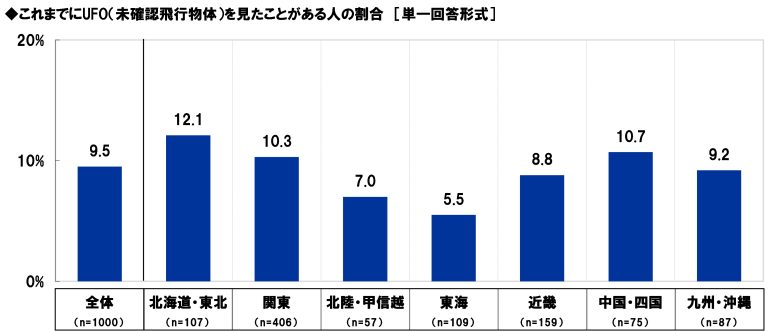 これまでにUFO(未確認飛行物体)を見たことがあるか聞いたところ、見たことがある人の割合は9.5%だった。エリア別にみると、UFOを見たことがある人の割合は、北海道・東北(12.1%)、関東(10.3%)、中国・四国(10.7%)では10%を上回った。