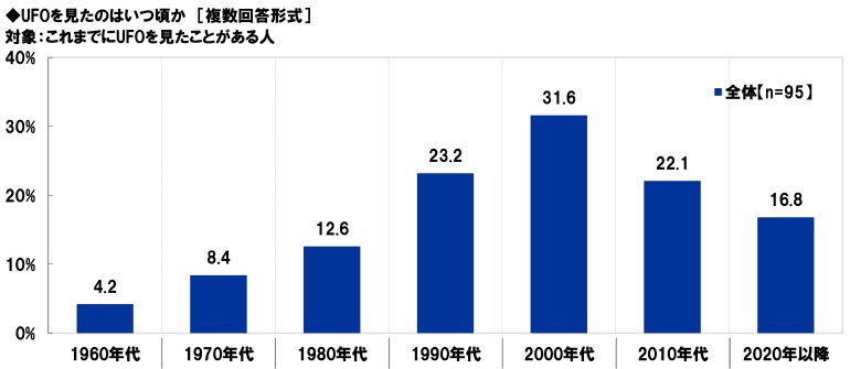これまでにUFOを見たことがある人(95名)に、UFOを見たのはいつ頃か聞いたところ、「2000年代」(31.6%)が最も高くなり、2000年代以降は「2010年代」が22.1%、「2020年以降」が16.8%と、割合が下降する結果となった。
