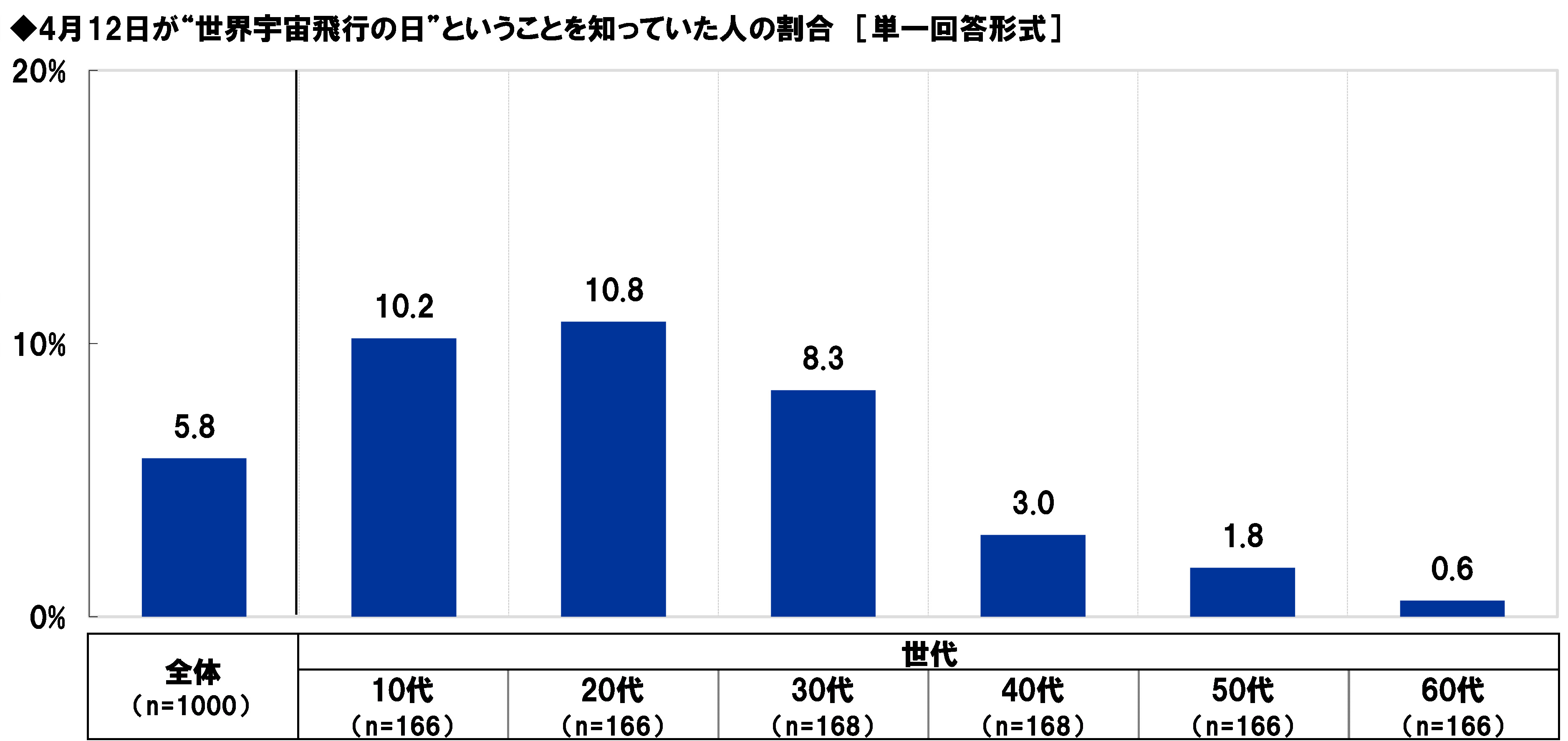 「4月12日が“世界宇宙飛行の日”ということを知っていた」6%、20代では11%