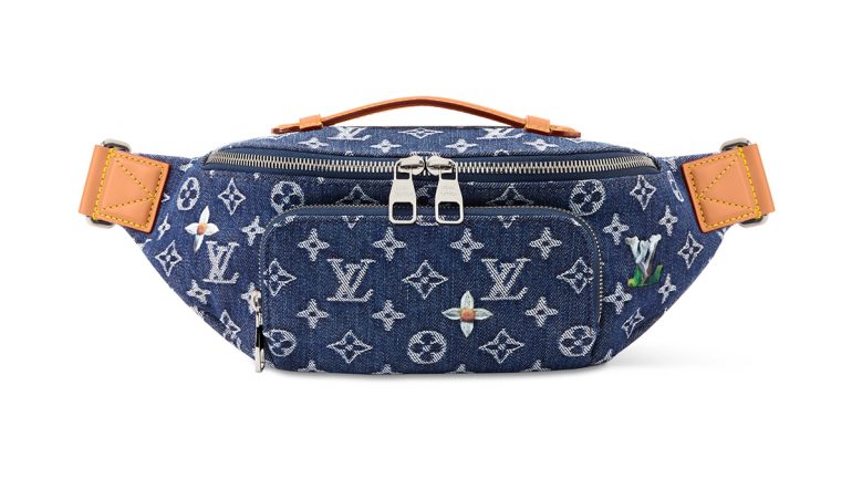 モノグラム·フラワー デニムにレザーのトリミングとトップハンドルをあしらったスポーティな「ラッシュ·バムバッグ」。機能的かつカジュアルな印象を演出。