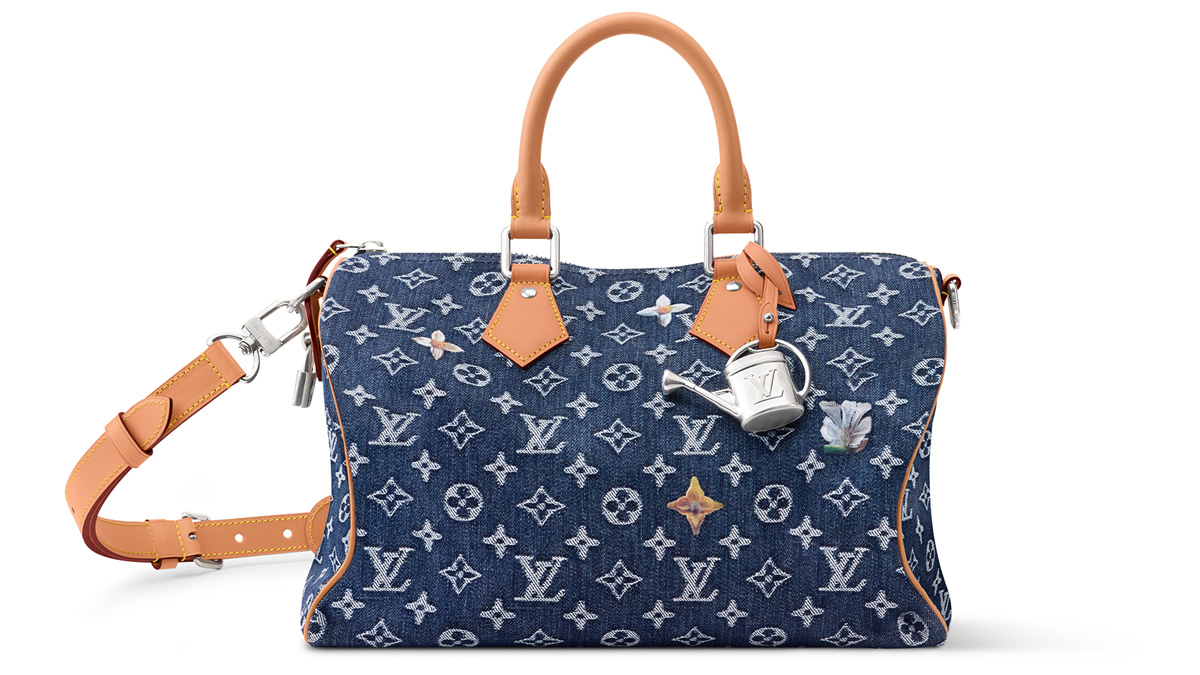 モノグラム·フラワー デニムに、レザーのトリミングとトップハンドルでアクセントを添えた「スピーディ·バンドリエール 30」。ジョウロのチャームが夏らしい雰囲気を引き立てる。