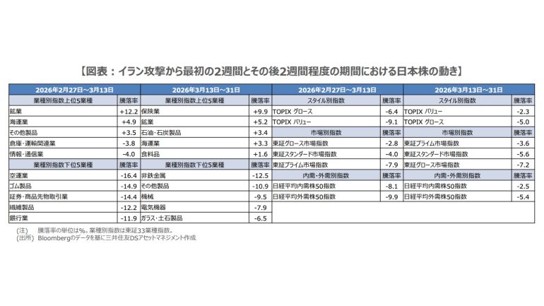 このように、業種別の指数などについて、イラン攻撃から最初の2週間と、その後2週間ほどの動きを振り返ると、多くの指数に変化がみられ、慎重ながらも過度な警戒が和らぎつつある模様だ。