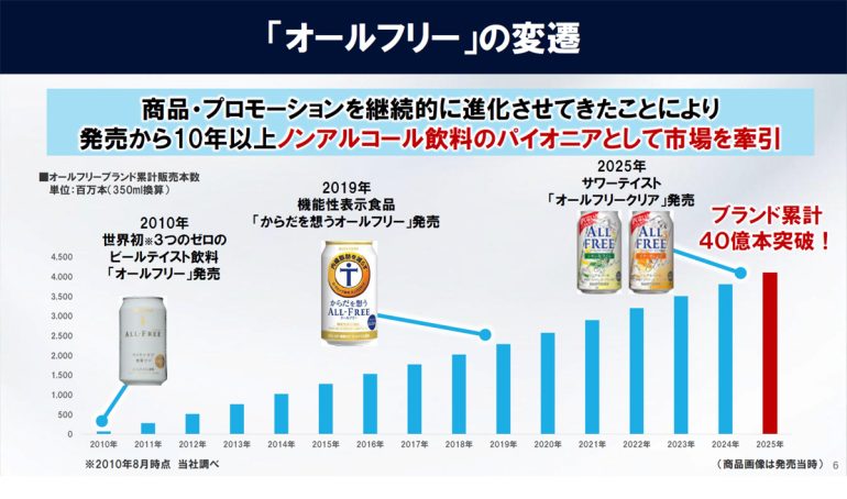 2019年には機能性表示食品「からだを想うオールフリー」を、2025年にはサワーテイスト「オールフリークリア」を発売するなど選択肢を増やし、2025年にはブランド累計40億本を突破。