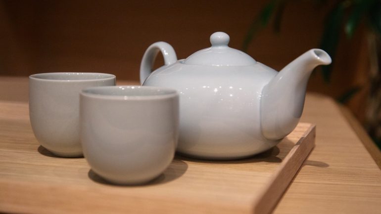1階のフロント・ラウンジでは、香りや茶葉の色が異なる無印良品の3種類のお茶の中から、宿泊客が選んだお茶をその場で淹れて提供するおもてなしサービスを行なう。
