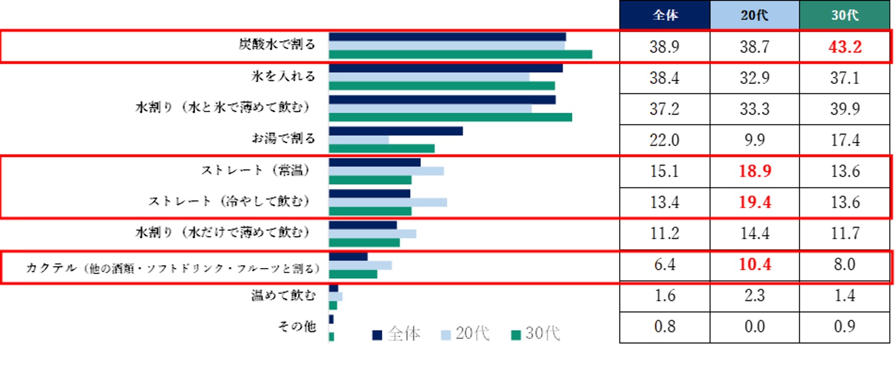 炭酸割りが主流、20代では「ストレート」、「カクテル」の支持率が増加