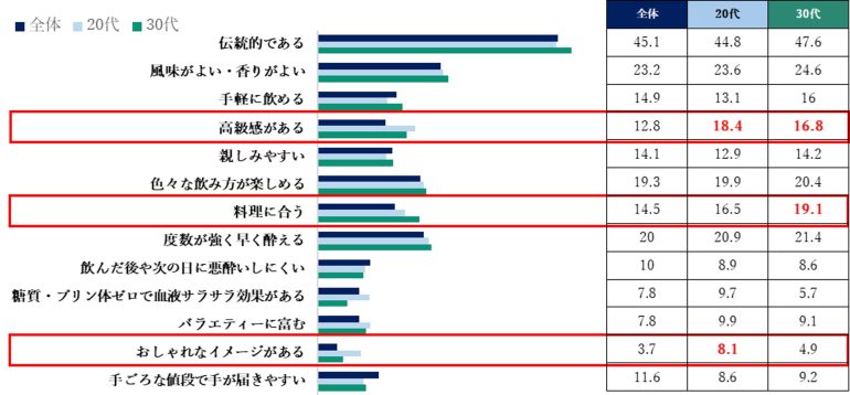 年代別に見ると、20-30代においても全体傾向同様、「伝統的である」というイメージが最も多い結果になった。20-30代は「高級感がある」「おしゃれである」「料理に合う」といったイメージが全体平均を上回っている。
