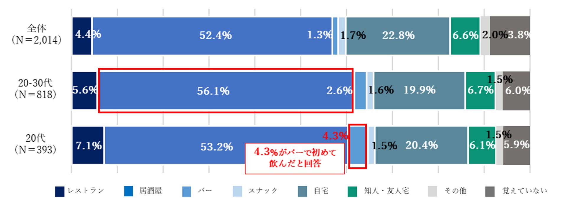 20-30代が本格焼酎・泡盛を初めて飲んだ場所は、全体傾向と同様に「居酒屋」が56.1%で最も多い結果となった。20代では、全体傾向と比べて初めて飲んだ場所が「バー」の割合(4.3%)が高くなっている。