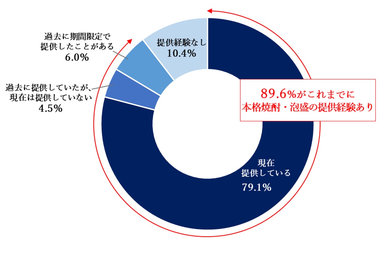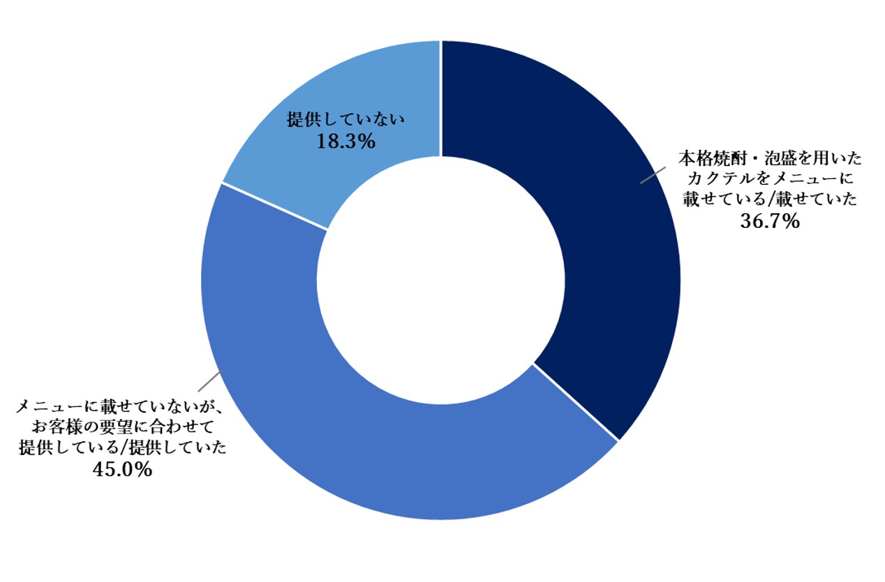 本格焼酎・泡盛を現在提供している店舗は全体の8割を占め、提供経験のある店舗は約9割に上る。また、本格焼酎・泡盛を用いたカクテルを提供した経験がある店舗が81.7%で、そのうち「メニューに載せていない」店舗が45.0%となった。