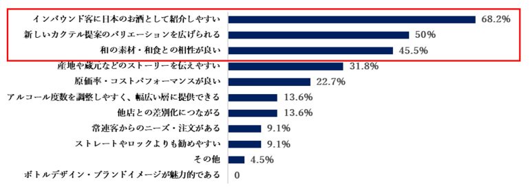 提供する理由は「インバウンド向けに紹介しやすい」(68.2%)が最も多く、「カクテルのバリエーション拡充」(50.0%)や「和の素材・和食との相性」(45.5%)が続いた。