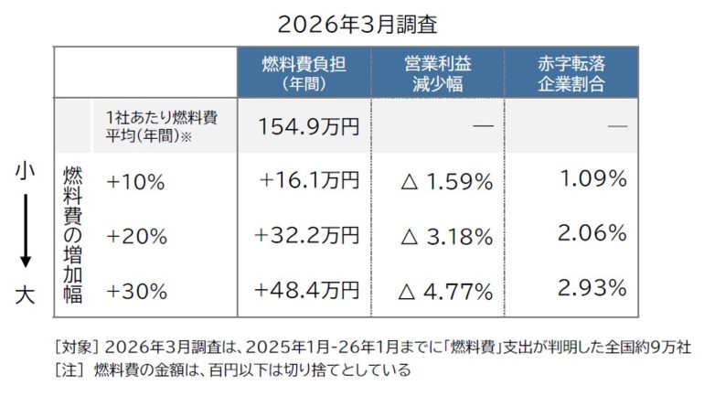 帝国データバンクは、同社が保有する企業データベースから、2025年1月〜26年1月までに決算を迎えた企業財務データを対象として、ガソリン・軽油など「燃料費」の高騰に対する企業業績への影響度に関する試算・分析を実施した。