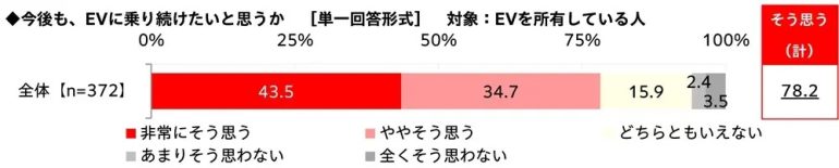 今後も、EVに乗り続けたいと思うか聞いたところ、『そう思う(計)』が78.2%となり、大多数がEVを今後も乗り続けることに前向きであることがわかる。