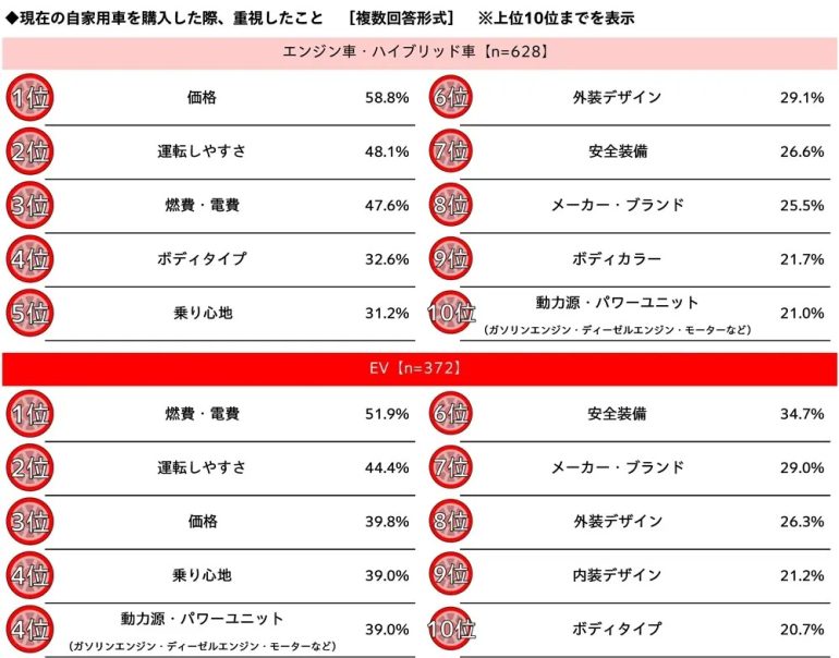 他方、EVオーナーでは、1位「燃費・電費」(51.9%)、2位「運転しやすさ」(44.4%)、3位「価格」(39.8%)、4位「乗り心地」「動力源・パワーユニット」(いずれも39.0%)という結果に。