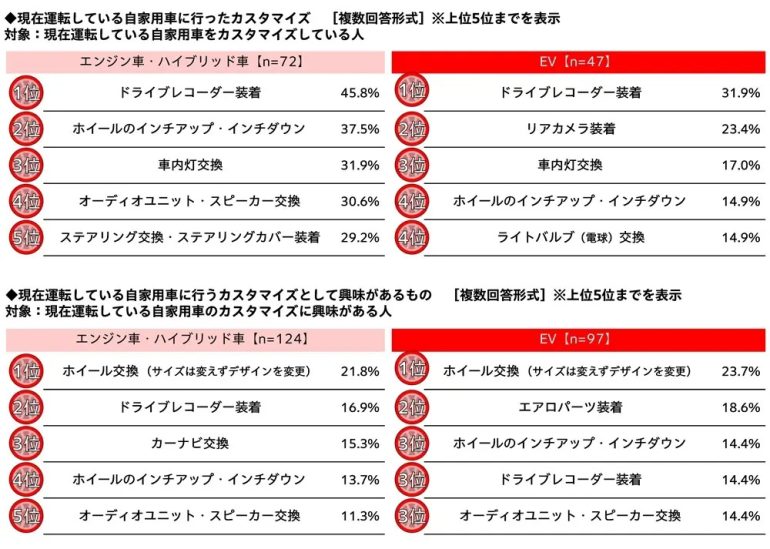 エンジン車・ハイブリッド車では2位「ドライブレコーダー装着」(16.9%)、3位「カーナビ交換」(15.3%)、EVでは2位「エアロパーツ装着」(18.6%)、3位「ホイールのインチアップ・インチダウン」「ドライブレコーダー装着」「オーディオユニット・スピーカー交換」(いずれも14.4%)で続く。